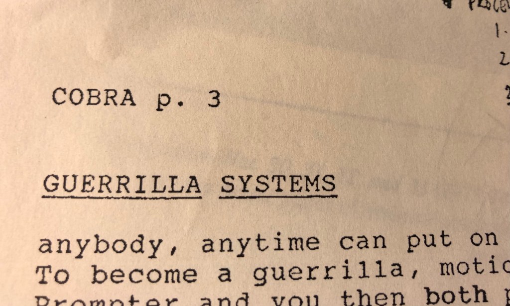 This was brought home to me in vivid fashion when I performed in John Zorn’s game piece Cobra, as he was the visiting composer that first semester. An announcement was posted on the department bulletin board asking for volunteers and I was the only one to sign up. The list was taken down, favors were called in. Consequently my name was left off the program. I tried banjo and electric bass. Not sure which one won out. I had no idea what I was doing. It was like learning how to drive a stick shift. Give it gas, let out the clutch, and the engine stalls. A perfect introduction to experimental music.
