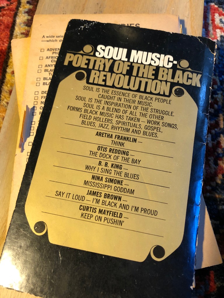 Mr. Nicholas speaks from a viewpoint common to that period — “Soul music is the expression of the Black man’s [my italics] condition…” He speaks of “Amerika.” He states “…Black culture is basically a defense against the dominance of white culture.” In a ten page introduction he lays out the history, beginning with a James Weldon Johnson quote that in itself begins with “In 1619…” A reference that found its voice in 2019 1. Nicholas follows this passage with the “double meaning” of spirituals used to guide enslaved people moving on the Underground Railroad. See Colson Whitehead’s The Underground Railroad (2016). Mr. Nicholas follows with “During and after World War I, there were mass migrations of Blacks from the agrarian South to the industrial North— the endless trek… to Detroit auto industry, to Chicago packing houses…” See The Warmth of Other Suns Isabel Wilkerson, (2010).